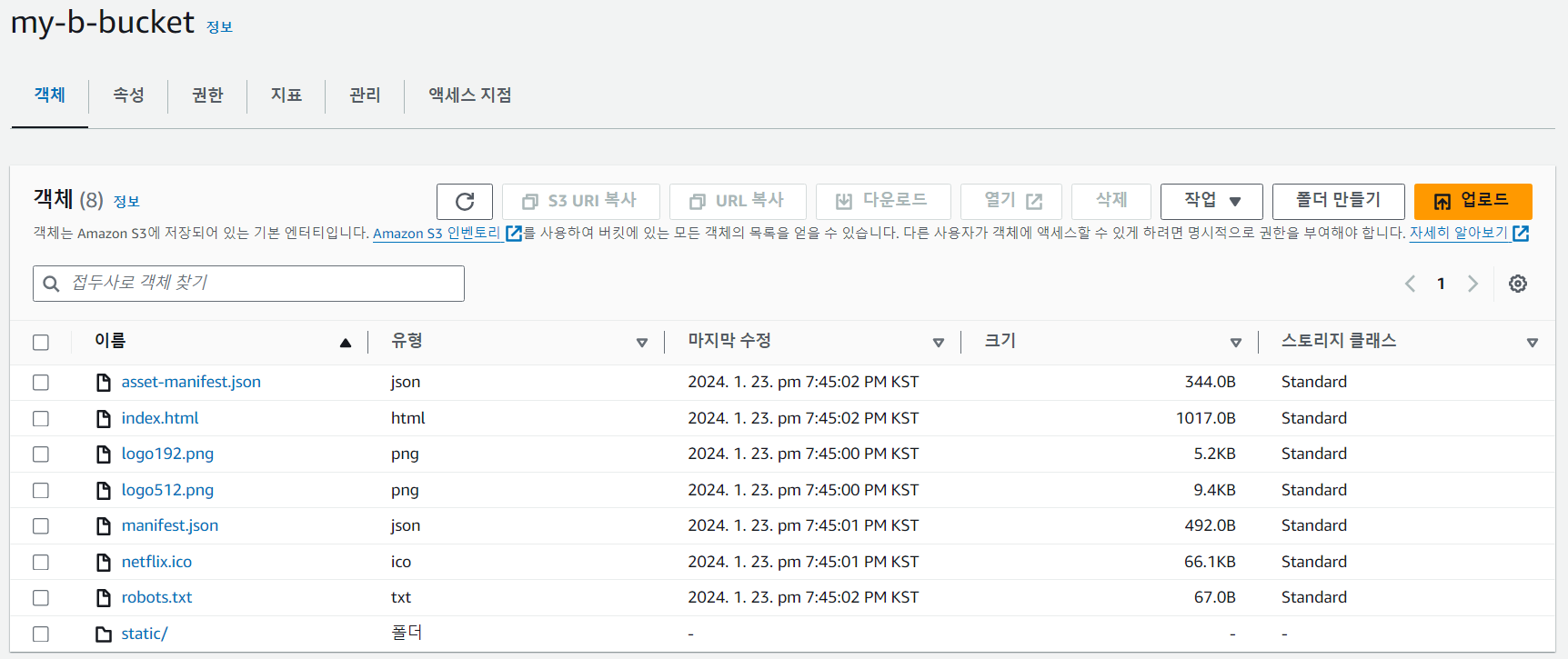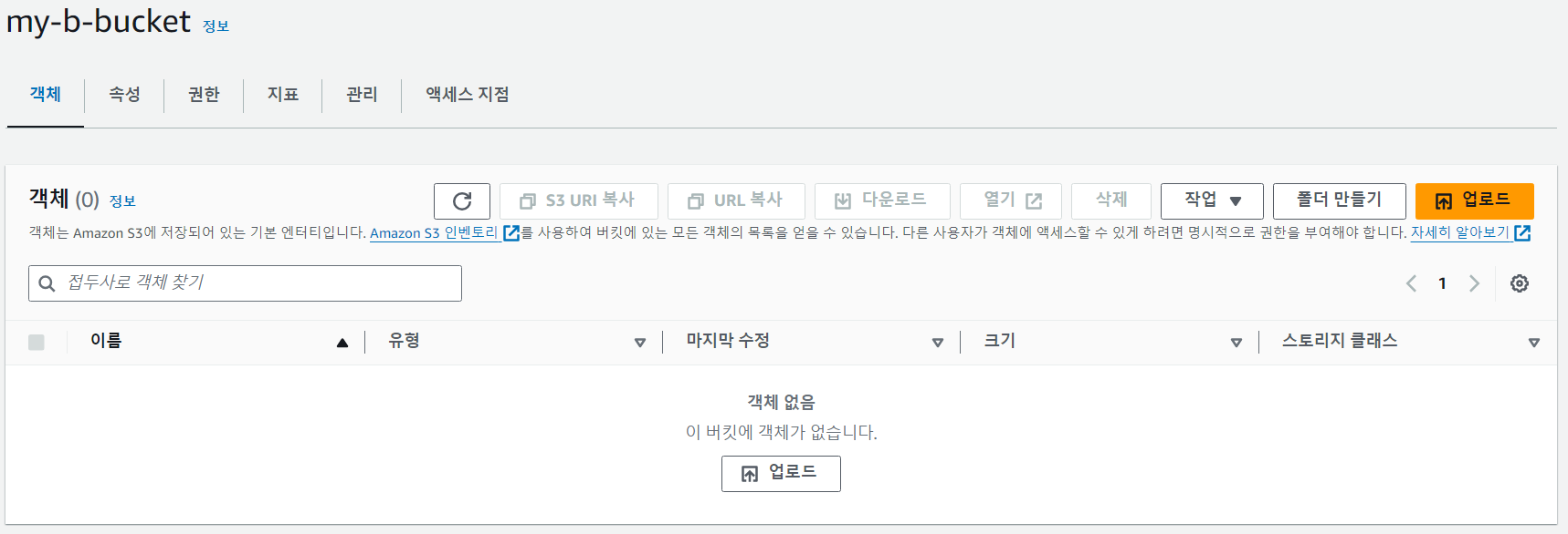 버킷을 클릭하면 객체 탭에 아래와 같은 화면이 뜬다.