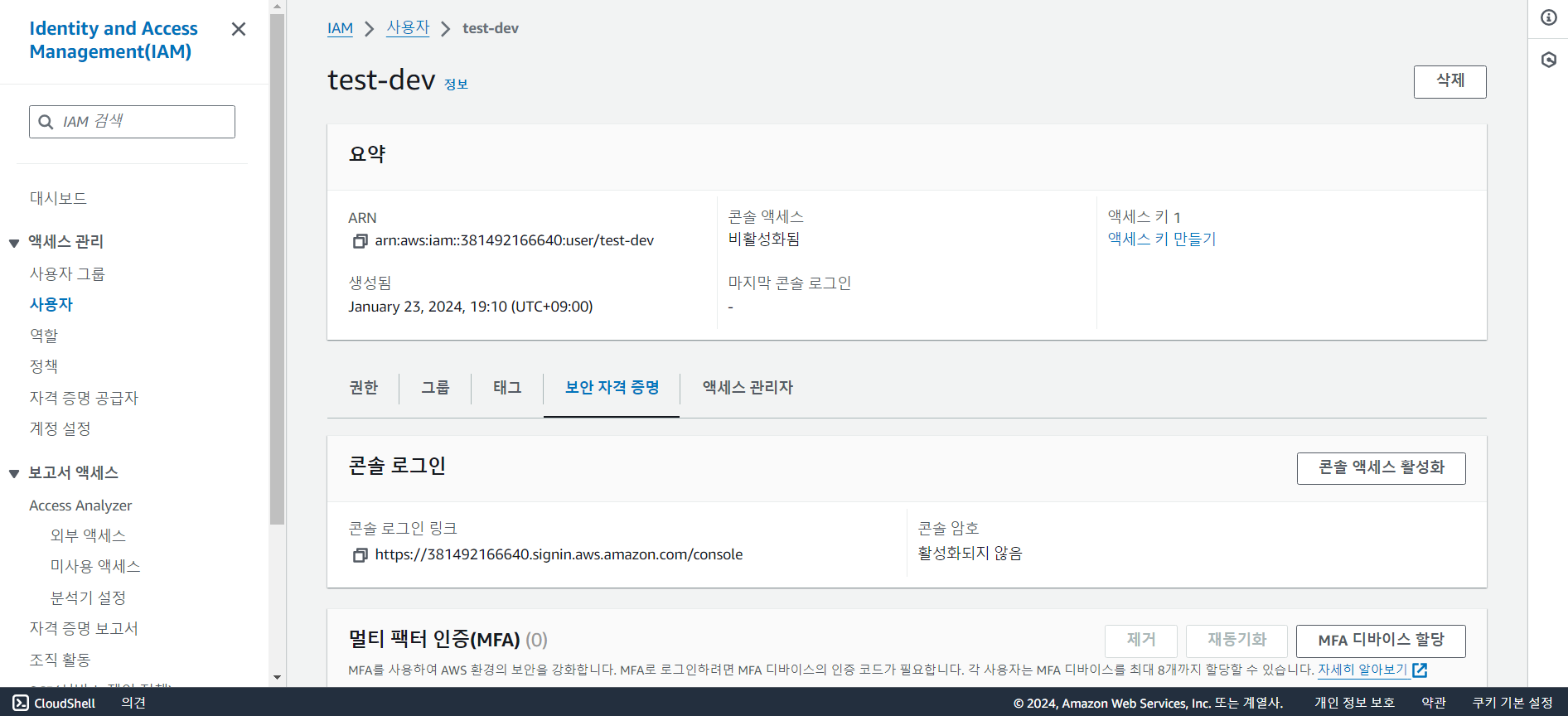 생성된 사용자를 클릭하고 보안자격증명 탭으로 들어간다.