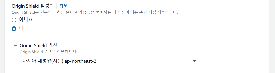 Origin Shield를 활성화하고 리전을 선택한다.
