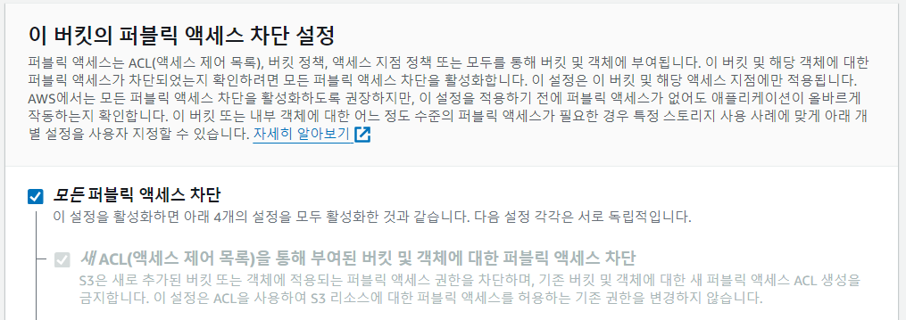 만약 퍼블릭 엑세스를 허용하게 되면 S3를 통해 정적 호스팅이 가능해진다. 나는 CloudFront를 통해 캐시된 CDN 서버에 데이터를 요청할 것이기 때문에 차단하였다.