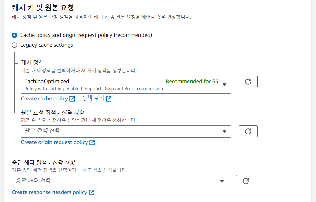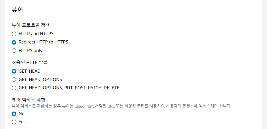 <뷰어 프로토콜 정책> : HTTP를 HTTPS로 리다이렉트 시켜준다.