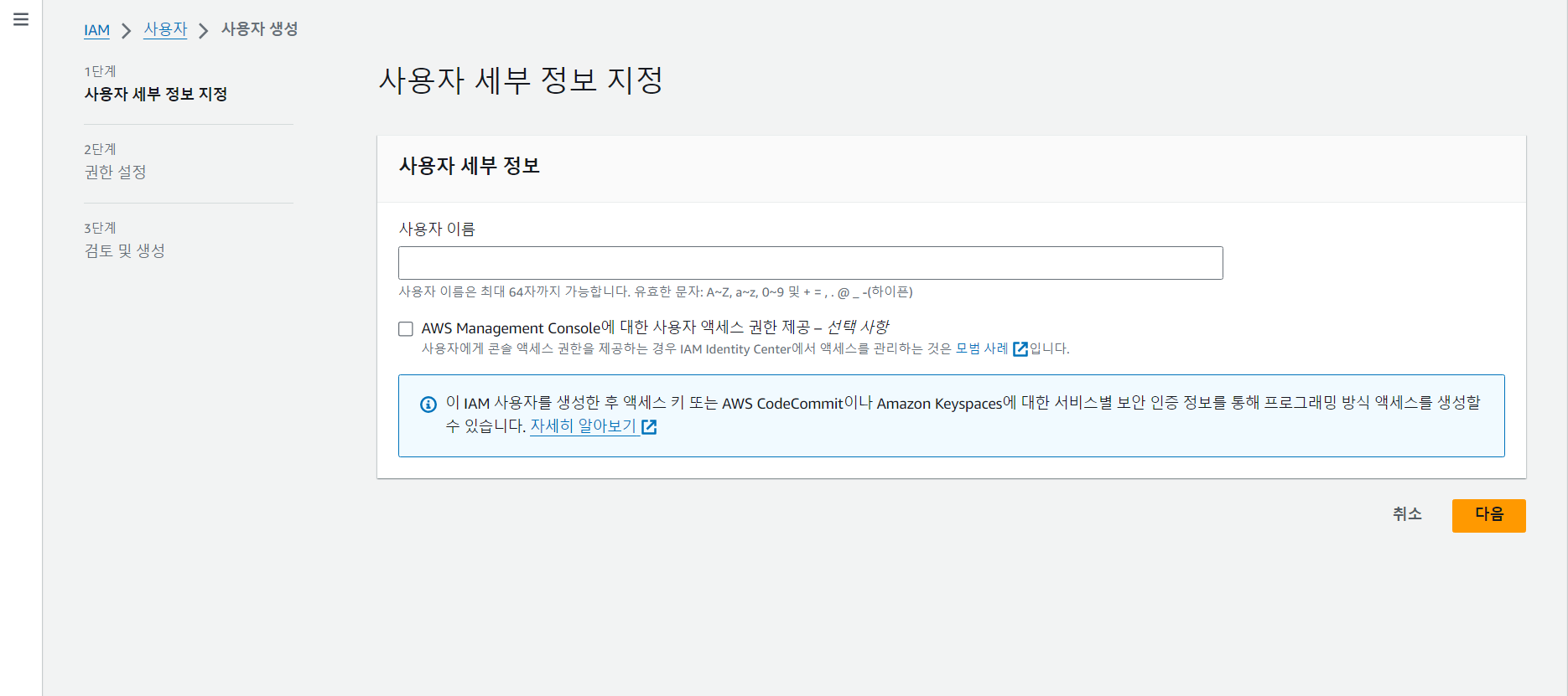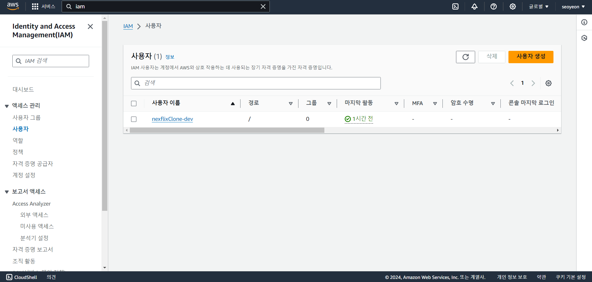 1. 상단 검색창에 IAM 검색 => 왼쪽 사이드바에서 '사용자' 메뉴 => 오른쪽 상단 사용자 생성 버튼 클릭