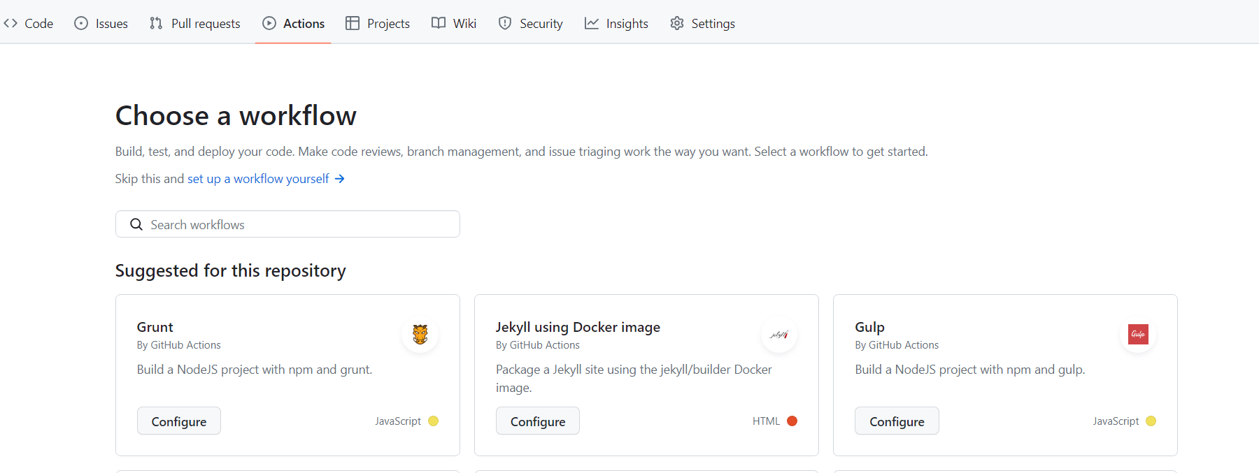 레포지토리의 Actions 탭에서 workflow를 생성한다.'set up a workflow yourself' 링크를 통해 템플릿 없이 직접 세팅하였다.