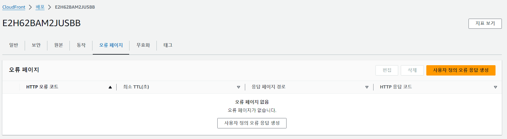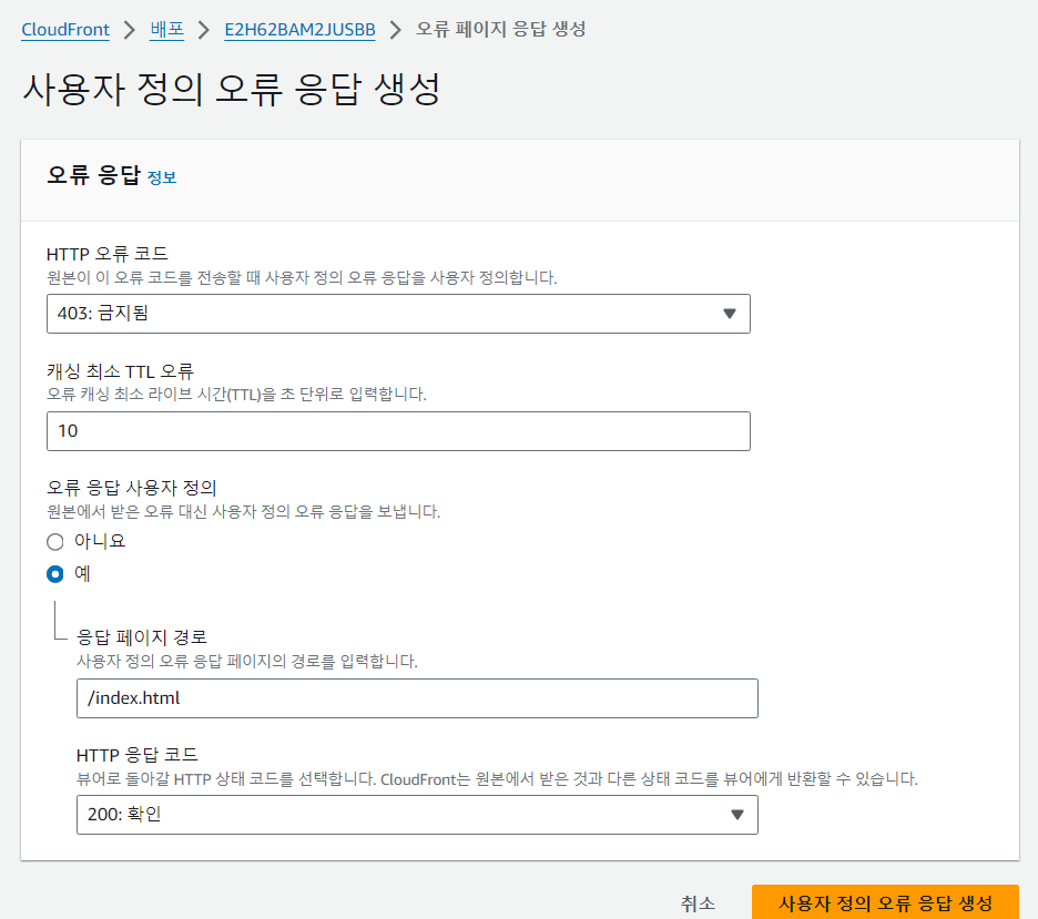 CloudFront의 오류페이지 탭 > 사용자 정의 오류 응답 생성 버튼 클릭