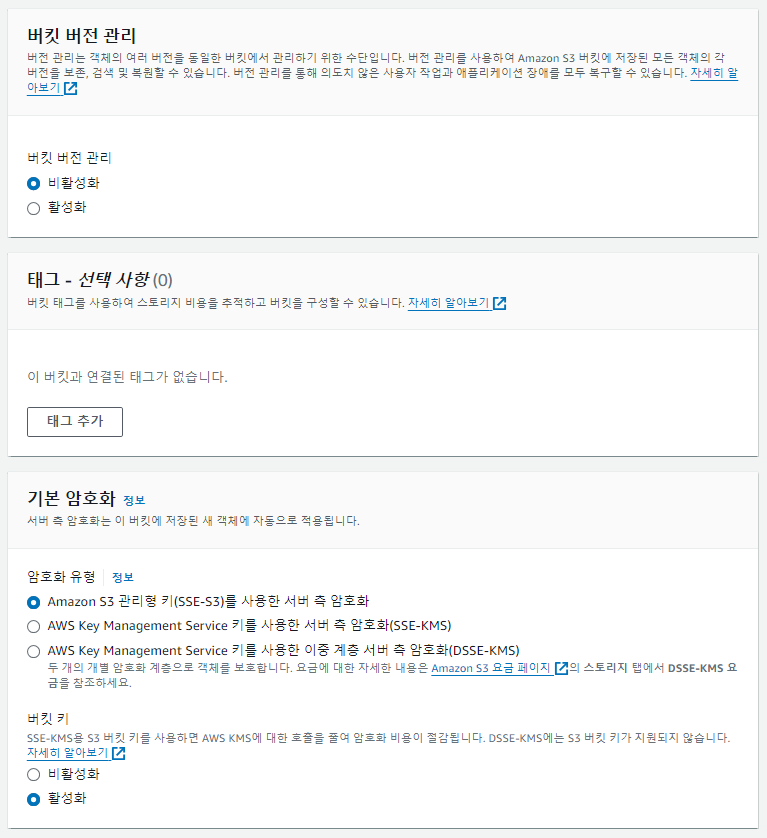 <버킷 버전 관리> : 업로드한 파일들의 versioning이 필요할 때 활성화한다.