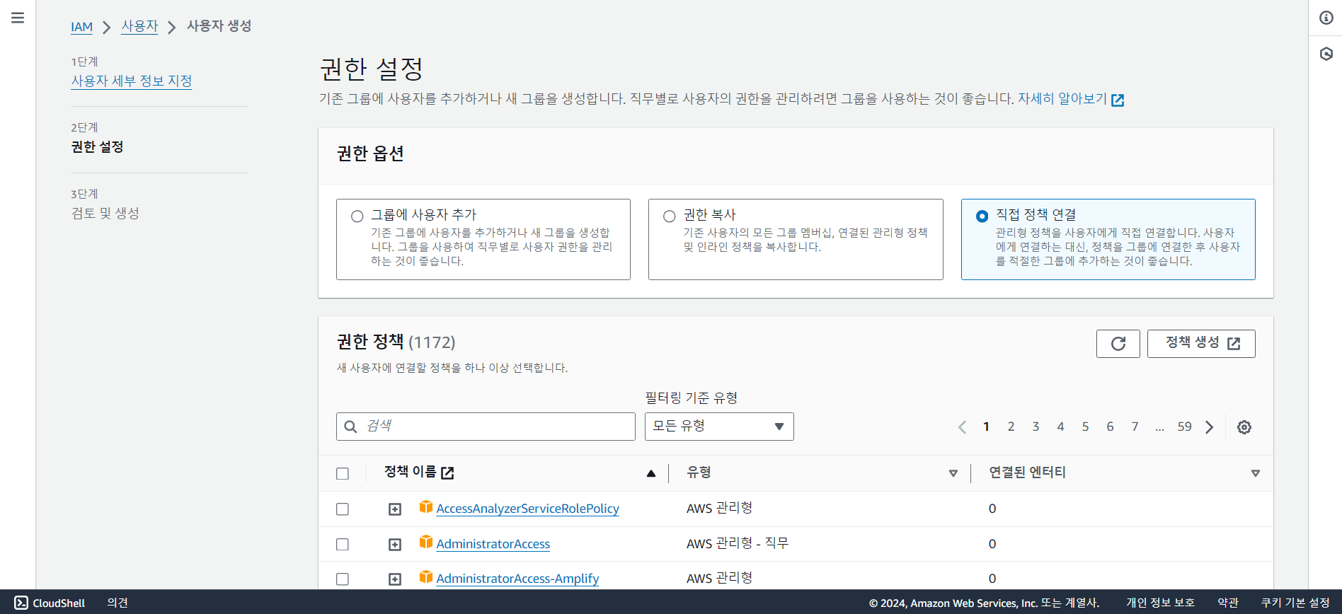 <권한 옵션>에서 직접 정책 연결을 선택한다