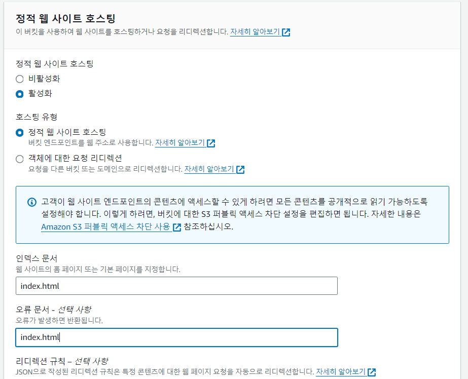 4. 생성한 버킷을 사용한 웹 사이트 호스팅 설정