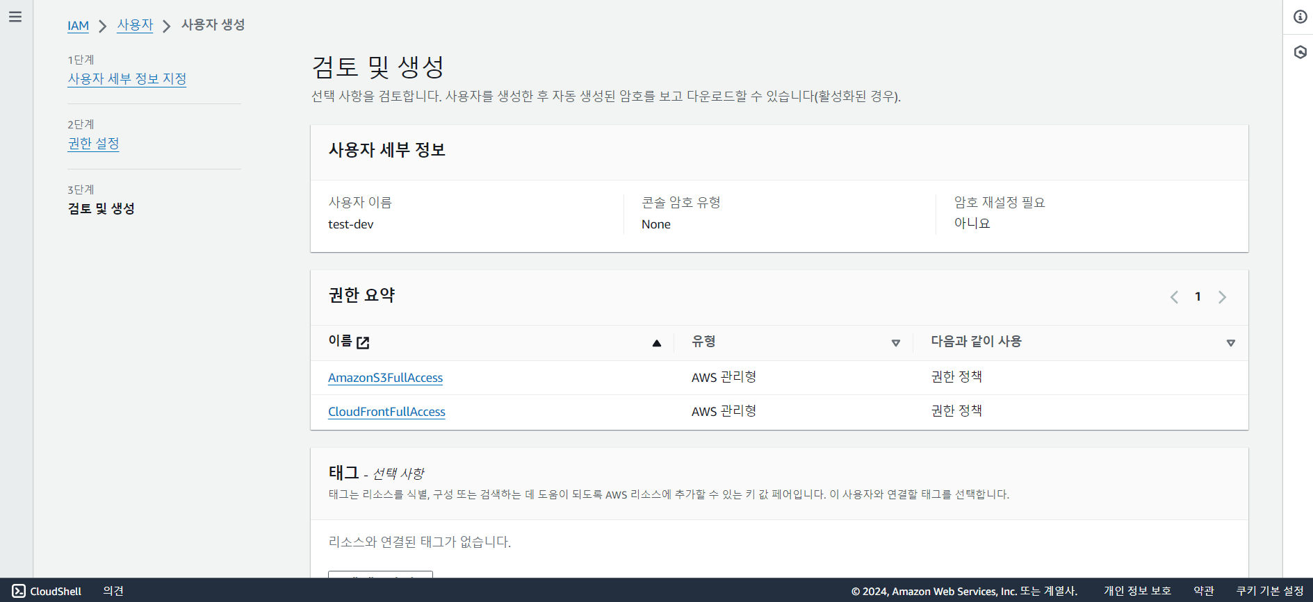 <권한 정책>에서 S3, CloudFront 접근 권한을 얻기 위해 AmazonS3FullAccess, CloudFrontFullAcess 권한을 추가한다.
