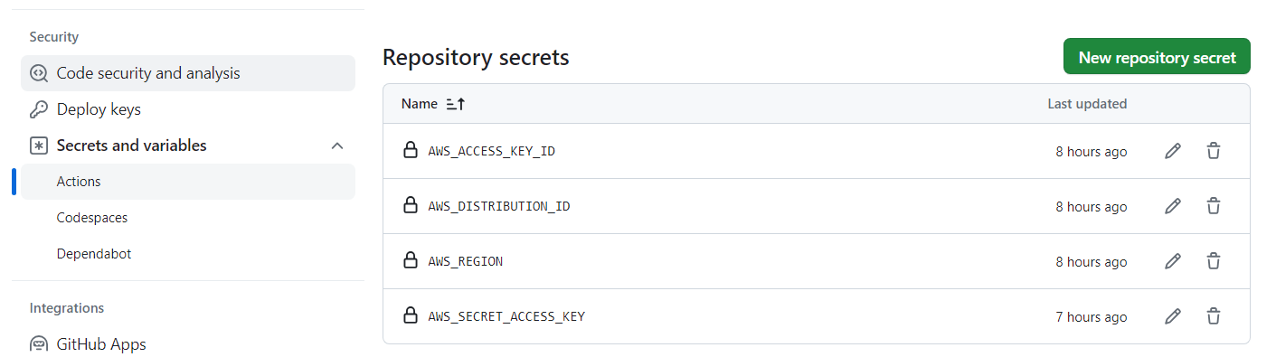New repository secret 버튼을 눌러 아래와 같이 4개의 secrets를 설정한다.