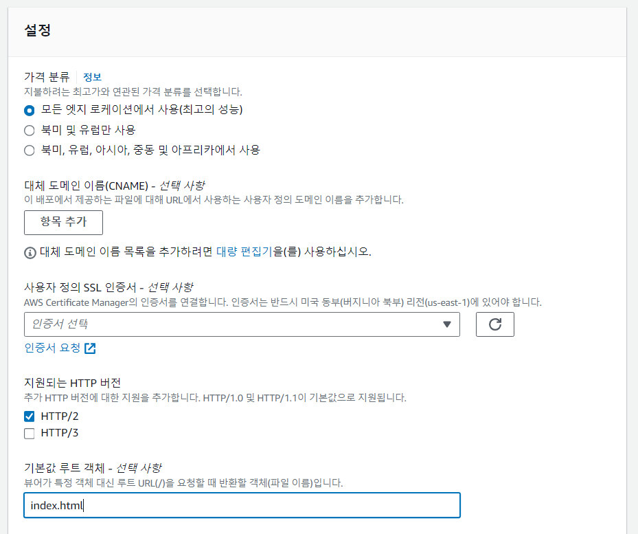 나머지 설정은 그대로 둔 채 cloudFront를 생성한다.