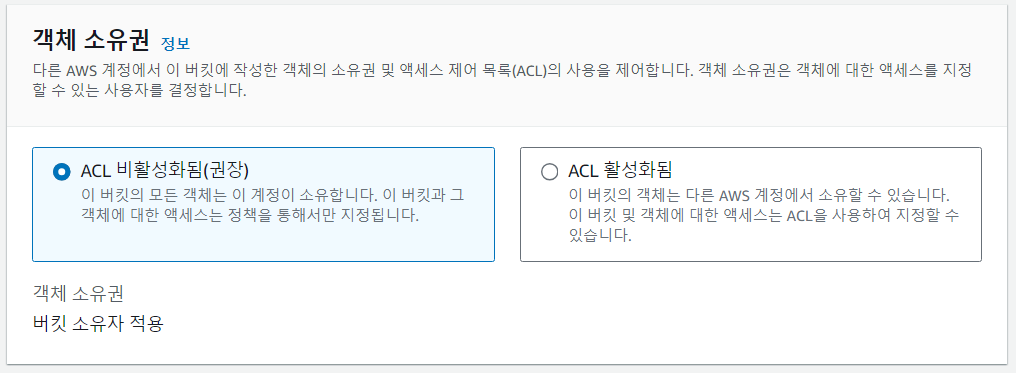 버킷의 접근 권한을 내 계정에만 주기 위해서 ACL을 비활성화한다.