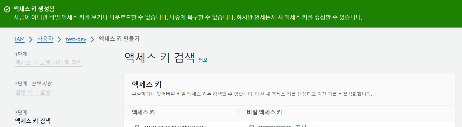 상단 문구에 나온 것 처럼 비밀 엑세스 키는 다시 확인할 수 없으니 별도로 잘 보관해두도록 한다.