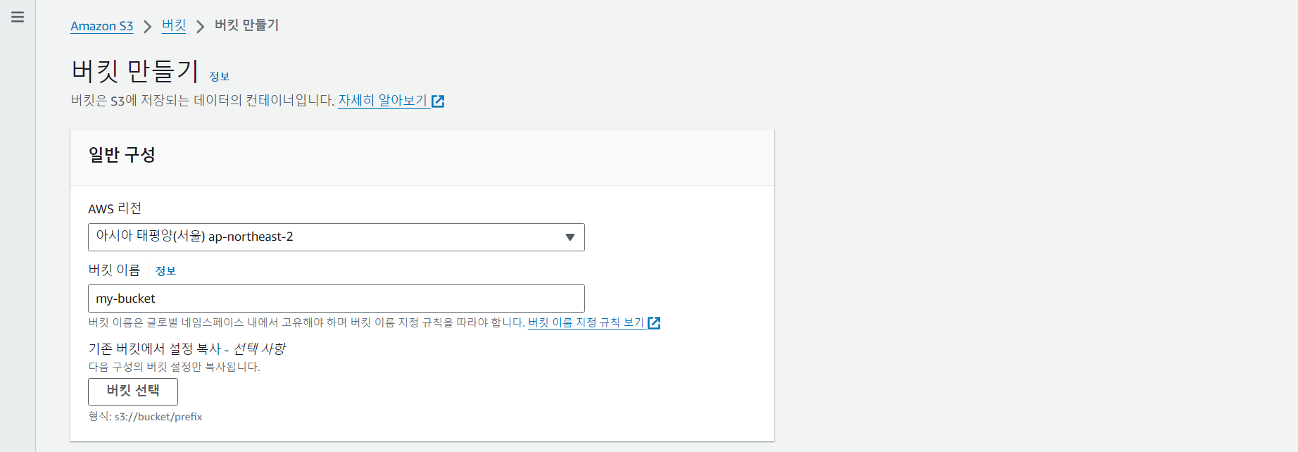 버킷의 이름을 입력하고 aws 리전을 선택한다.