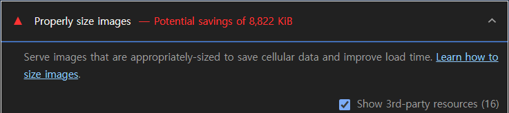 그리고 가장 많은 썸네일이 사용되는 랜딩 페이지에서 리사이징 전후로 Lighthouse 검사를 진행했고, 경고문에서 확인할 수 있는 저장 공간 절약량이 리사이징 후에 90% 정도 줄어든 효과를 보았다.