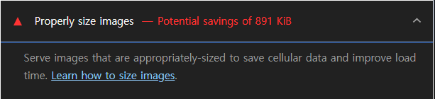 그리고 가장 많은 썸네일이 사용되는 랜딩 페이지에서 리사이징 전후로 Lighthouse 검사를 진행했고, 경고문에서 확인할 수 있는 저장 공간 절약량이 리사이징 후에 90% 정도 줄어든 효과를 보았다.
